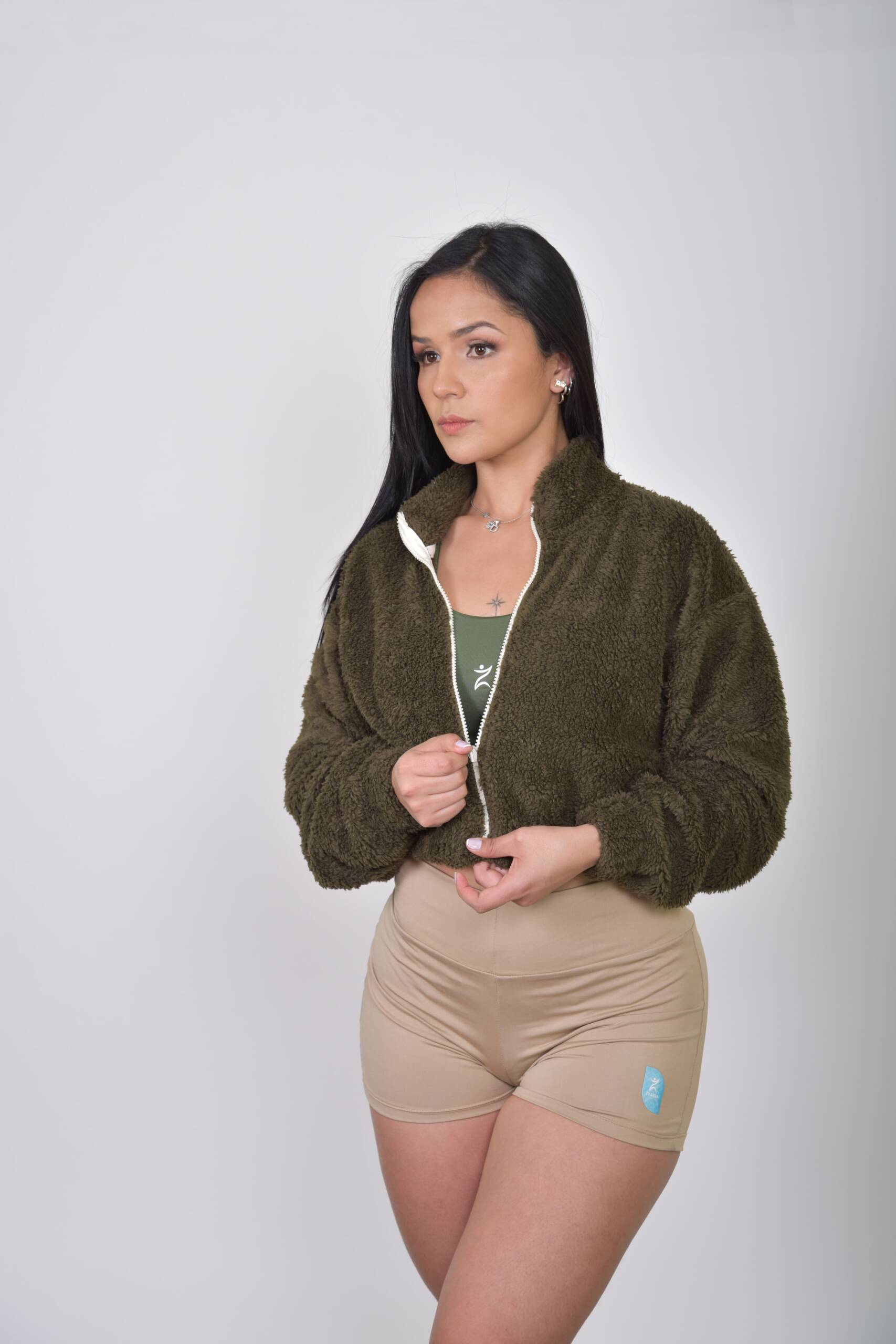 Chompa oversize, largo a la cadera, Mangas largas con caída relajada Cuello alto, Cierre frontal completo.